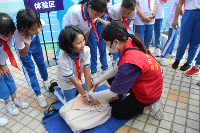 廣東伍玖伍安全文化科技有限公司為開發(fā)區(qū)第五小學師生帶來了一場安全知識“盛宴”。主持人周恒向學生們詳細介紹了現(xiàn)場布置的“隱患排查”“模擬火災”“觸電感覺”“應急救護”“心肺復蘇”等十大學習體驗區(qū)。