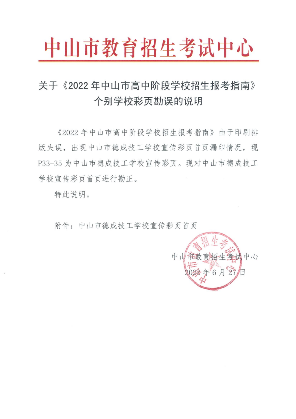 關(guān)于《2022年中山市高中階段學(xué)校招生報(bào)考指南》個(gè)別學(xué)校彩頁勘誤的說明
