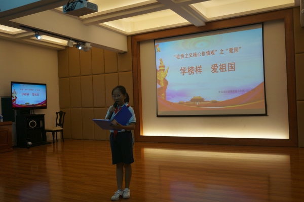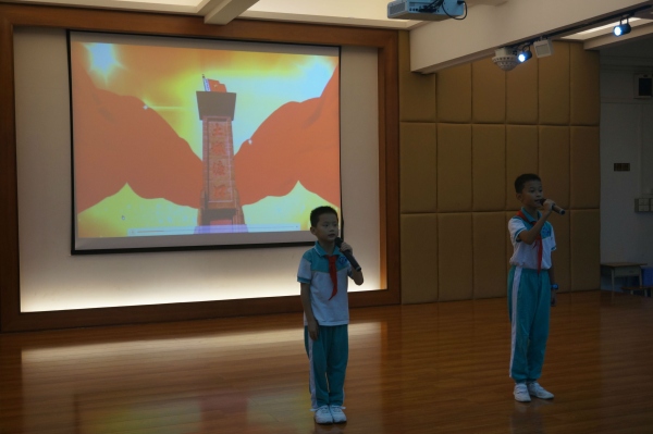 活動(dòng)在莊嚴(yán)的隊(duì)儀式后正式開始。首先,主持人請(qǐng)各小隊(duì)的隊(duì)員上來分享他們?cè)谡n下收集的關(guān)于毛澤東主席和周恩來總理的事跡,通過視頻、小品和詩朗誦的方式,隊(duì)員們了解了這些偉大的領(lǐng)袖人物的事跡,繼而在全體隊(duì)員心目中樹立起榜樣。隊(duì)員在活動(dòng)中,還紛紛表示要向這些偉大的人物學(xué)習(xí)。接著,在了解了這些榜樣人物之后,隊(duì)員們還想到了,作為小小的少先隊(duì)員,沒有辦法像這些偉人和英雄一樣為祖國做貢獻(xiàn),但是可以從自己做起,從身邊的小事做起,愛祖國,愛人民。于是,隊(duì)員們利用課余時(shí)間,排演了《當(dāng)國歌響起時(shí)》和《撿起國旗》兩個(gè)小品,告訴隊(duì)員們?nèi)绾巫鹬匚覀兊膰韬蛧???duì)員們深受啟發(fā),明白了這些身邊的小事都是我們隊(duì)員日常生活中可以做的愛國行為。接著,隊(duì)員們就在“小心心”貼紙上寫下了自己的愛國宣言,然后全體隊(duì)員把這些愛國宣言貼到了中國版圖的展板上,把內(nèi)在的愛國之情用實(shí)際的行動(dòng)展示出來。