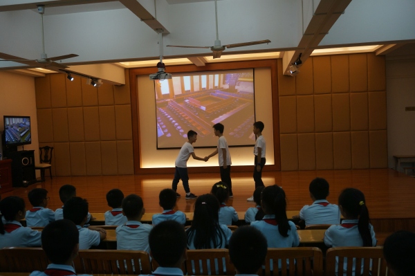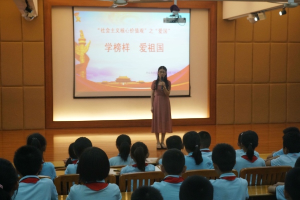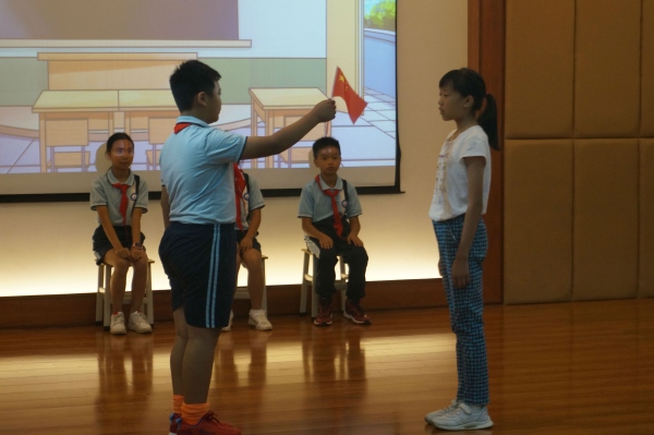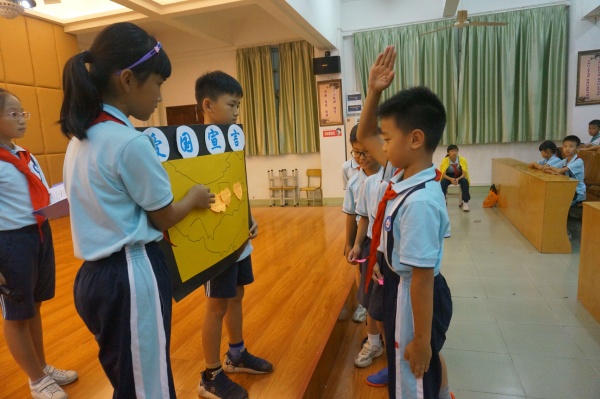 為積極響應(yīng)中山市教研室關(guān)于開展中小學(xué)“愛國”德育主題班(隊(duì)團(tuán))課教學(xué)活動(dòng)的號(hào)召,中山市沙溪鎮(zhèn)虎遜小學(xué)四(2)中隊(duì)于2019年10月24日下午開展了以“社會(huì)主義核心價(jià)值觀”之“愛國”——學(xué)榜樣,愛祖國為主題的隊(duì)課。在何溥彥輔導(dǎo)員的指導(dǎo)下,四(2)中隊(duì)的隊(duì)員們分小組籌劃了這次的中隊(duì)活動(dòng)。當(dāng)天下午,黃金奇校長(zhǎng)還召集全校的青年輔導(dǎo)員來參加了此次四(2)中隊(duì)的隊(duì)活動(dòng)。