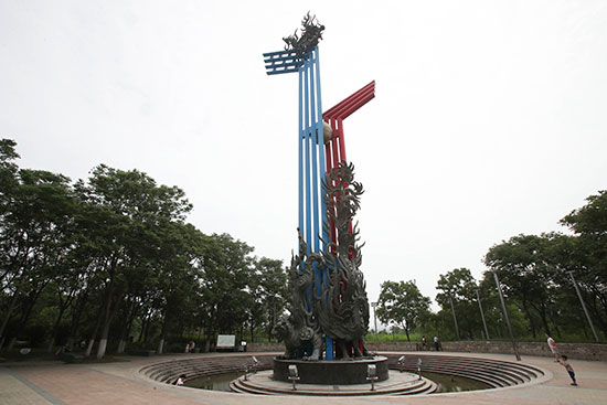 此外,采風(fēng)團成員還參觀了2018年安徽省第十四屆運動會主要場館蚌埠市體育中心,并在蚌埠龍子湖畔看到了南北氣候分界標(biāo)志。高39.9米的標(biāo)志中部有八根鋼管,其中四根藍(lán)色的指向北方,象征北方氣候寒冷,另外四根紅色的指向南方,象征南方氣候溫暖。標(biāo)志中間一顆青銅珍珠,表示蚌埠地處南北之間,集天南地北靈氣于一體。在蚌埠湖上升明月古民居博覽園內(nèi),450棟被修復(fù)重建的不同地區(qū)傳統(tǒng)民居建筑,讓采風(fēng)團成員贊嘆不已。在蚌埠市博物館里,大家對蚌埠古代歷史、近現(xiàn)代城市發(fā)展史以及淮河歷史文化也有了更深入的了解。