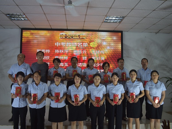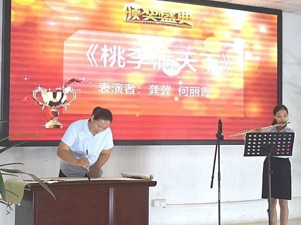 隨著一曲《掌聲響起來》,把大家?guī)У搅俗钭屓藵M心期待,動人心弦的頒獎環(huán)節(jié)。桂南學校對1名市級師德標兵、2名市級優(yōu)秀教師、1名區(qū)級優(yōu)秀教育工作者、7名校級優(yōu)秀班主任、40名校級優(yōu)秀教師、7名校級優(yōu)秀員工進行逐一表彰,并頒發(fā)了證書和獎金;還對今年中考工作中做出貢獻的16名教師頒發(fā)豐厚的獎金,希望通過表彰的方式,讓廣大教師能夠恪盡職守、刻苦專研,努力成為新時代合格教師。同時還對在桂南學校工作滿五年、十年、十五年的教師頒發(fā)紀念杯和純金紀念幣,讓所有老師都能感受到家的溫暖,在今后的生活和工作中更加有歸屬感和幸福感。晚會還穿插了現(xiàn)場書法、長笛演奏、詩歌朗誦等豐富多彩的文藝節(jié)目,給整個晚會增添了不一樣的色彩,整個現(xiàn)場氣氛融洽,高潮迭起,笑聲不斷。