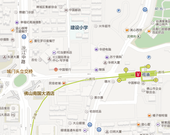 | 交通線路 | 路線一:乘搭地鐵廣佛線祖廟站(D出口),沿建新路走進入城門頭路,沿城門頭路走140米,右轉(zhuǎn)進入建設(shè)一街,沿建設(shè)一街走160米,到達佛山市建設(shè)小學(xué)。 路線二:乘搭公交車103、109、110、111、113、125、127、130、138、152、160、176、259、G14,科學(xué)館站下車繼續(xù)向前,沿汾江中路輔路走60米,左轉(zhuǎn)進入建設(shè)街,走130米,左轉(zhuǎn)進入建設(shè)一街,沿建設(shè)一街走30米,到達佛山市建設(shè)小學(xué)。 路線三:乘搭公交車103、106、111、116、118、122、123、125、126、128、130、137、159、164b、166、G12,祖廟路(百花廣場)站下車,沿祖廟路走240米,左轉(zhuǎn)進入城門頭路,沿城門頭路走140米,右轉(zhuǎn)進入建設(shè)一街,沿建設(shè)一街走160米,到達佛山市建設(shè)小學(xué)。 停車:駕車由城門頭路進入建設(shè)一街后直行20米,右轉(zhuǎn)進入興華商場停車場。 | ||||||||