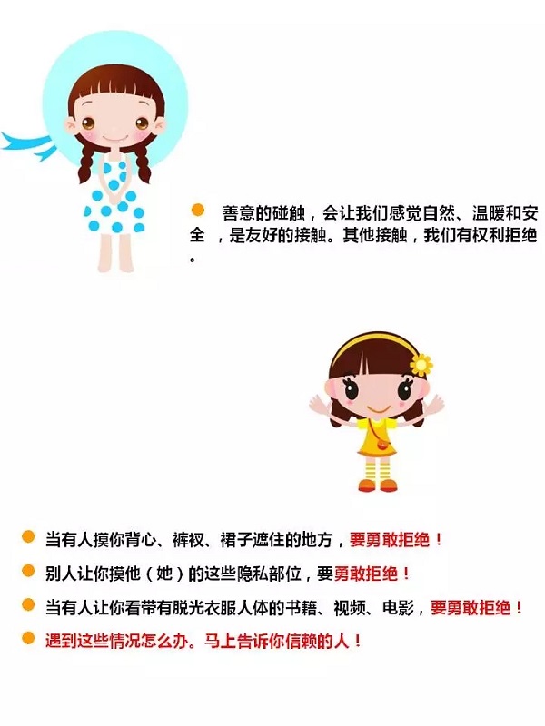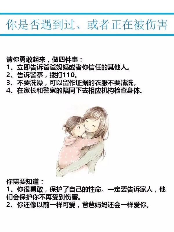 孩子需要有辨別壞人的能力,更需要有對壞人說“不”的勇氣。保護兒童任重道遠,這不僅是社會的責任、法律的義務、學校的職責,也是每一個爸爸媽媽必須傾盡心力做到的事情。所以我們應該告訴孩子,無論他面對什么困難和問題,只要不是主動傷害別人,爸爸媽媽會永遠相信她、保護她,孩子也應該要勇敢對壞人說“不”,不受壞人的威脅,有什么一定要和爸爸媽媽講,相信爸爸媽媽會永遠保護她!